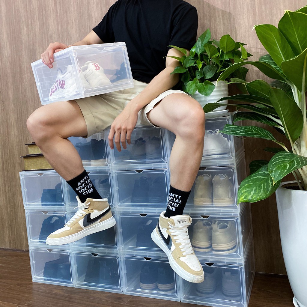 Hộp giày trong suốt có nắp đóng mở nên bạn dễ dàng thấy được những đôi giày trong hộp và giúp bạn dễ dàng khi lấy ra dùng.