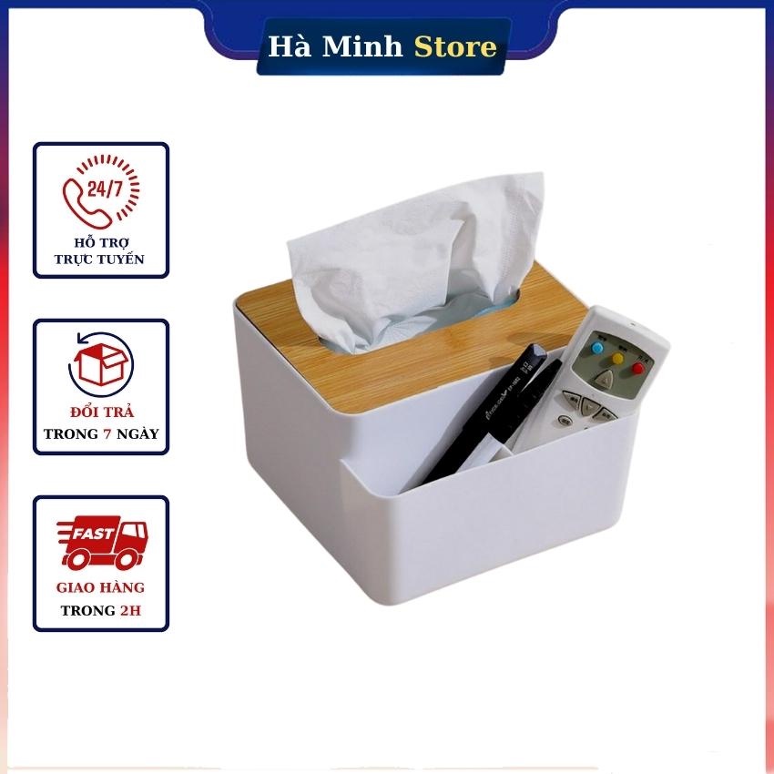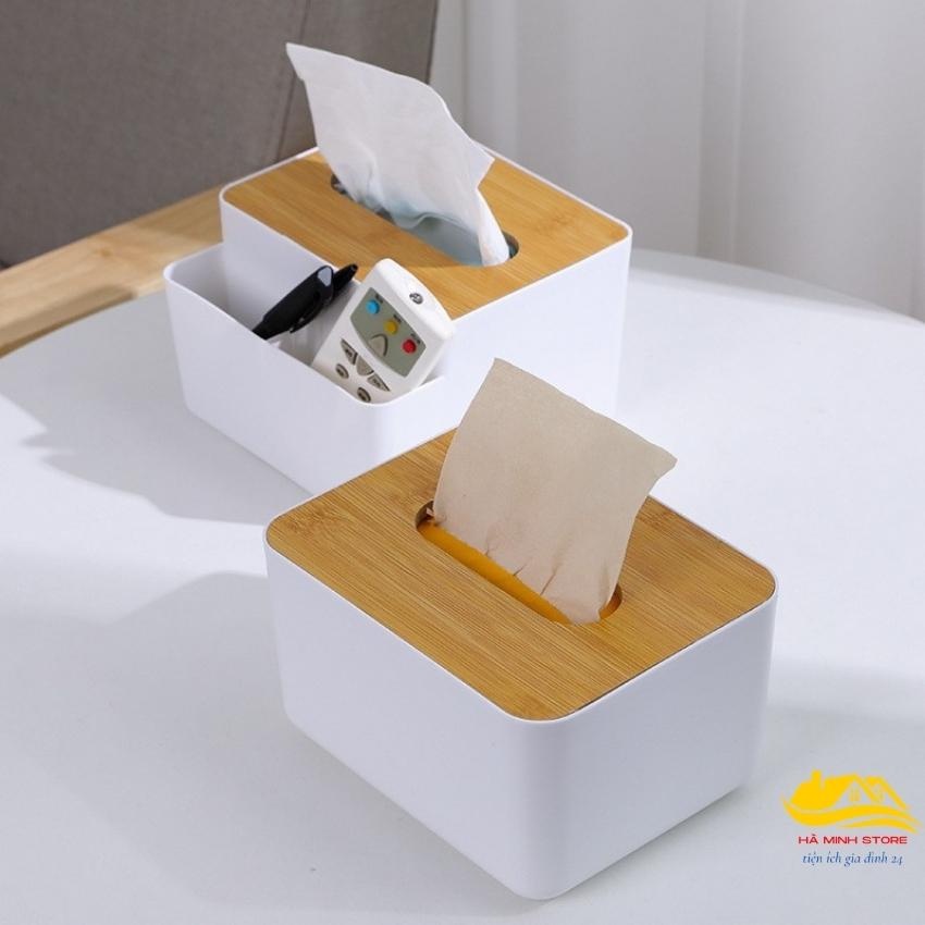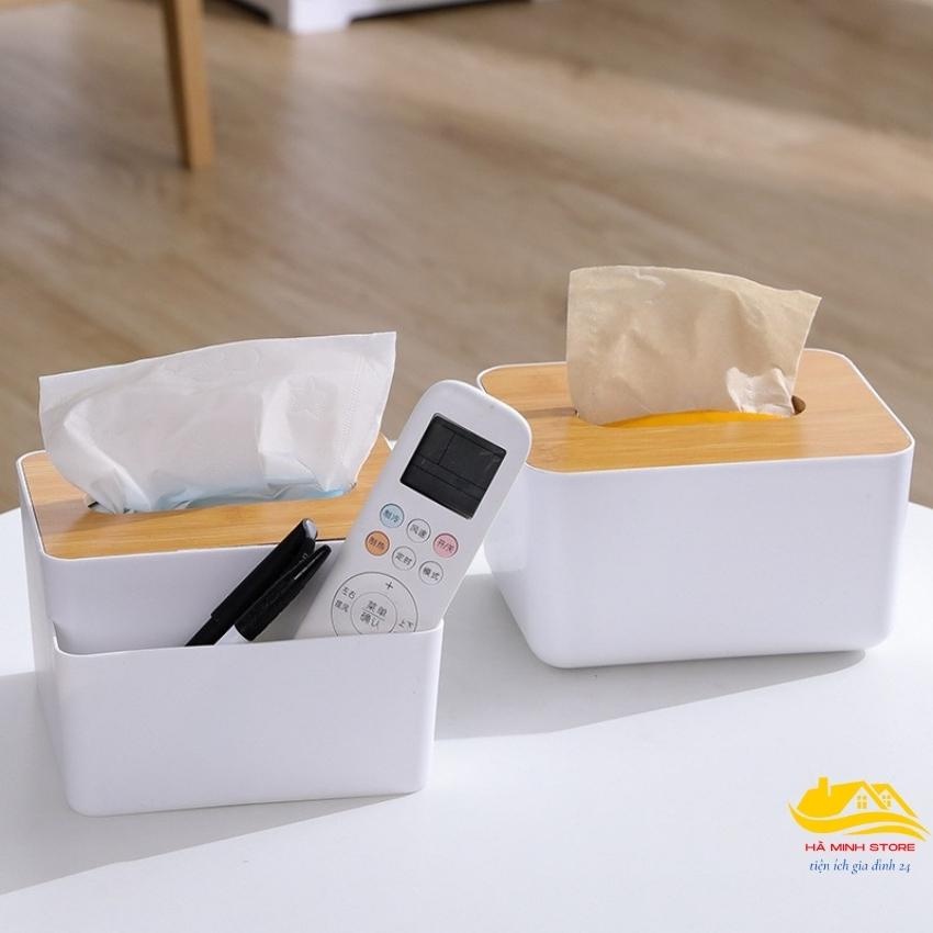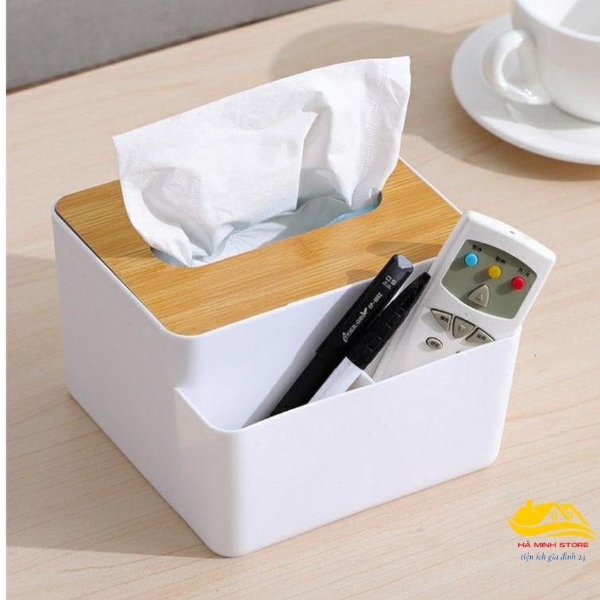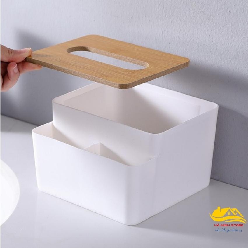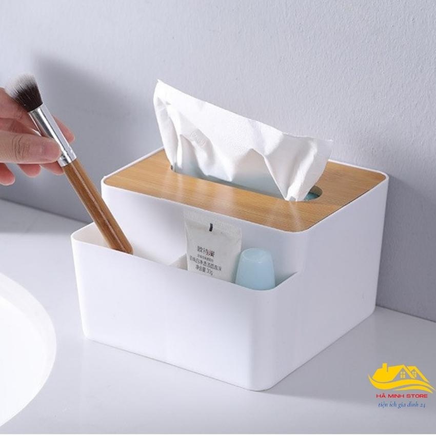 Hộp đựng giấy đa năng để bàn nhiều ngăn tiện lợi Hộp đựng khẩu trang để bàn song anh nắp gỗ