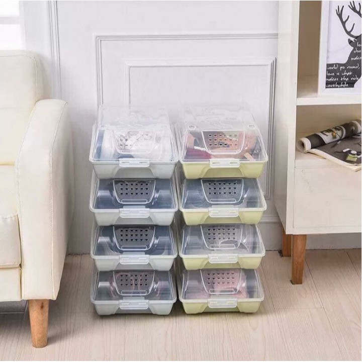 Hộp đựng Giày, Dép trong suốt có Nắp đậy thoáng khíHộp đựng giày được làm từ chất liệu nhựa trong suốt PP an toàn cho phụ nữ và trẻ nhỏ, giúp bạn dễ dàng tìm kiếm đôi giày yêu thích, tiết kiệm thời gian.