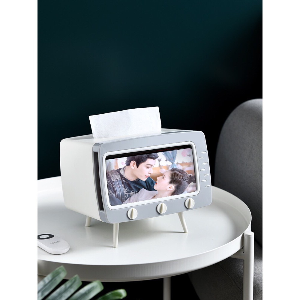 - Hàng mẫu mới 2020, thiết kế đẹp độc lạ hình dáng như chiếc tivi ngày xưa, mặt trước có chỗ để màn hình điện thoại, bên trong lại là hộp giấy ăn vô cùng tiện dụng, đặt trên bàn ăn mỗi gia đình vừa xem video trên điện thoại vừa rut giấy ăn lau khi cần thiết. Thích hợp cả cho các cô nàng anh chàng yêu phim lãng mạn tình củm cảm động vừa xem phim vừa khóc vừa rut khăn giấy lau nước mắt