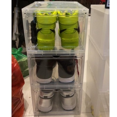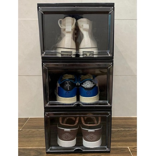 - Thân hộp đựng giày trong suốt dễ dàng thấy được đôi giày trong hộp.
