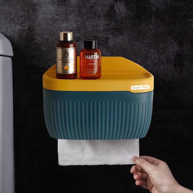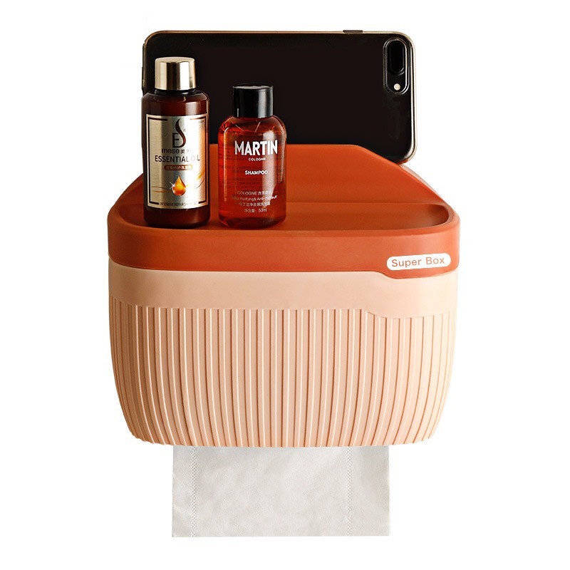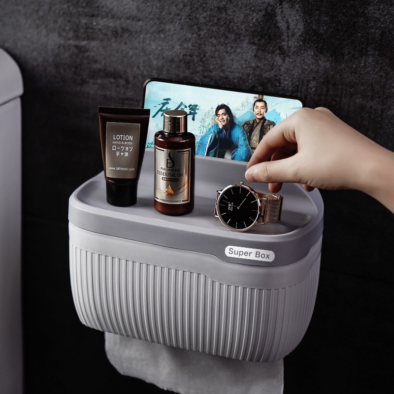 Hộp đựng giấy toilet đa năng.Phần trên có khe để điện thoại và không gian để đựng xà bông.