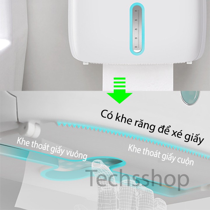 Nắp đậy có thể đóng mở 1 tay, phía trước kệ có khe trong suốt để theo dõi lượng giấy bên trong nhằm thay thế giấy khi sắp hết. Phía dưới hộp có khe răng dùng xé giấy thuận tiện