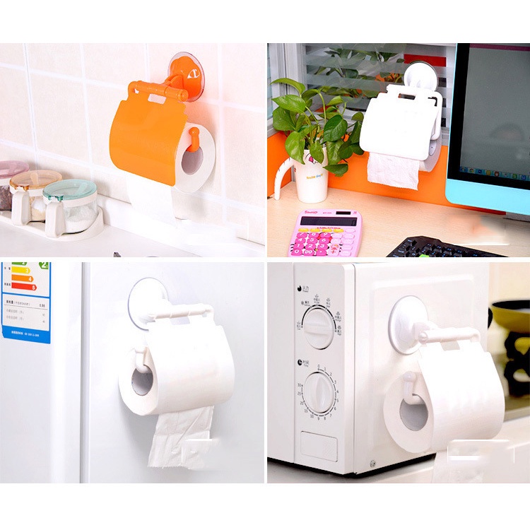 Hộp đựng giấy vệ sinh cuộn treo tường bằng nhựa, chống nước tiện lợi, giác hút chân không siêu bám dính.• GIÁ TREO GIẤY VỆ SINH CÓ NẮP CHE