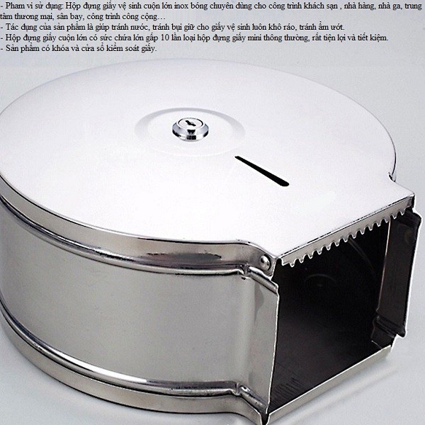 Pham vi sử dụng: Hộp đựng giấy vệ sinh cuộn lớn inox bóng chuyên dùng cho công trình khách sạn , nhà hàng, nhà ga, trung tâm thương mại, sân bay, công trình công cộng…