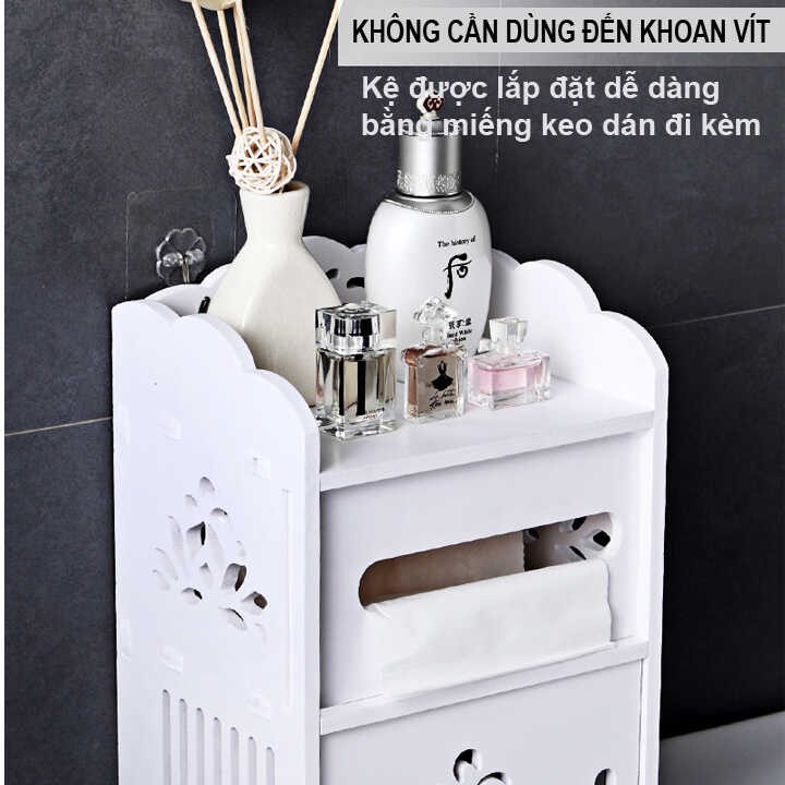 Kệ được lắp đặt dễ dàng bằng miếng keo dán đi kèm, không cần dùng đến khoan vít.