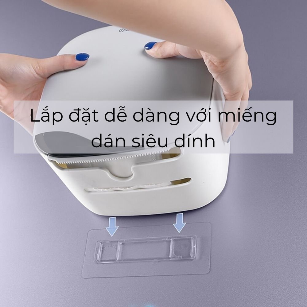 - Dán miếng treo tại vị trí cần đặt. Vuốt miếng dán cho chắc chắn. Cài hộp lên và chờ 2 tiếng trước khi bắt đầu sử dụng