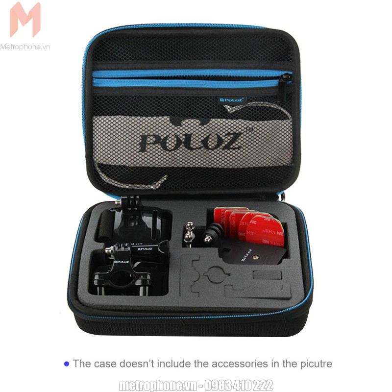 Hộp đựng GoPro và phụ kiện Action Cam được chia làm 2 phần. Phần nắp trên túi dạng lưới có khóa kéo thường để những phụ kiện như gậy, dây đeo, keo 3m. Phần thân chính của hộp chống sốc GoPro có nhiều ngăn nhỏ. Các ngăn nhỏ được ngăn cách lớp mút đệm chống sốc, chống va đập vào nhau.
