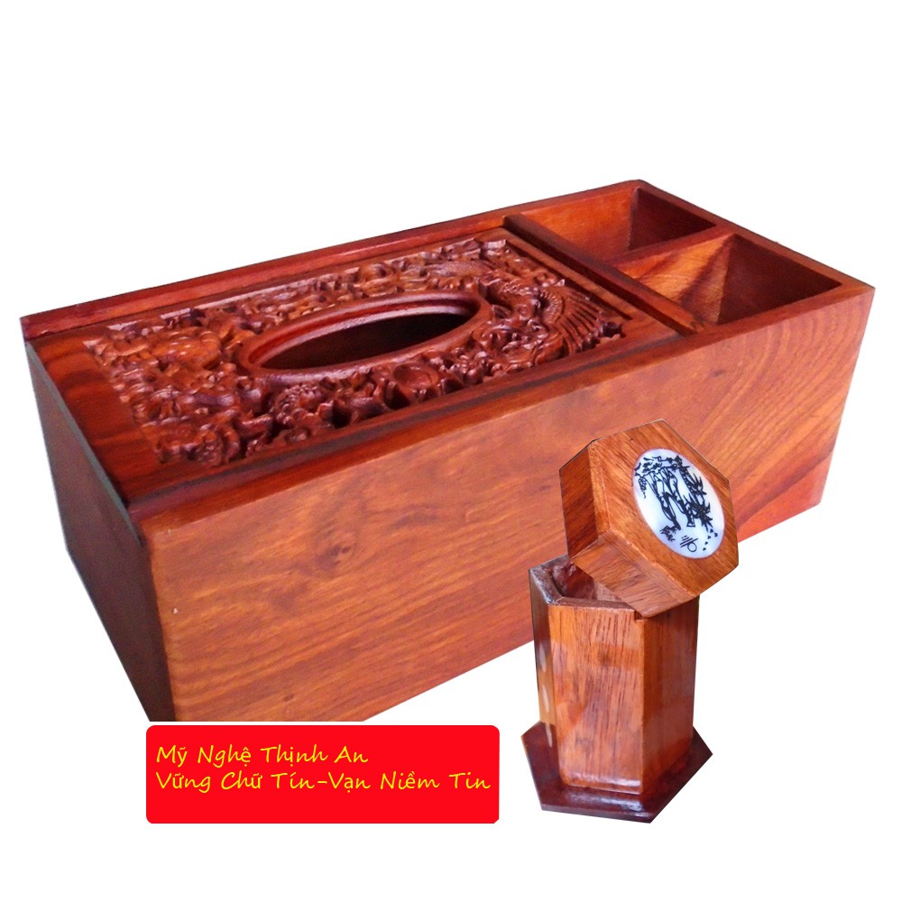 Hầu hết tất cả các gia đình đều sở hữu ít nhất một hộp đựng giấy ăn trong nhà. Nhưng gia chủ còn muốn đồ vật của mình sử dụng luôn phải thể hiện được nét cá tính, sự sang trong và gu thẩm mỹ của chính gia đình mình. Nếu bạn muốn tôn lên nét sang trọng, khả năng lựa chọn đồ dùng tinh tế, gu thẩm mỹ đặc biệt, lại đảm bảo an toàn cho sức khỏe thì chỉ một hộp đựng giấy ăn 3 ngăn bằng gỗ hương cao cấp loại a của chúng tôi là sự lựa chọn hoàn hảo. Các vị khách đến nhà chỉ cần nhìn vào hộp giấy đã thấy được sự chu đáo đến từng chi tiết của gia chủ . Bởi chiếc hộp gỗ mỹ nghệ khảm trai không chỉ là một đồ dùng mà còn là một vật trang trí cho ngôi nhà. Chiếc hộp được làm chắc chắn, linh hoạt nắp kéo tiện lợi phía trên ngăn chứa khan giấy,còn có them hai ngăn để chứa các vật dụng hay sử dụng như điều khiển TV(remote),máy lạnh,bút viết ….chất liệu gỗ hương ta đỏ tự nhiên quý hiếm,được trạm lọng hoa văn vô cùng cầu kỳ tinh xảo từ đôi bàn tay khéo léo của các nghệ nhân làng nghề Việt.Hộp khăn ăn này có thể là món quà tặng ý nghĩa và độc đáo gửi tới những người thân thiết xa gần trong và ngoài nước hay đối tác làm ăn.sử dụng các sản phẩm thủ công mỹ nghệ cũng là cách ủng hộ cho các sản phẩm tôn vinh nét đẹp Việt Nam nói chung,và các làng nghề truyền thống đang dần mai một trên khắp làng quê Việt nói riêng.