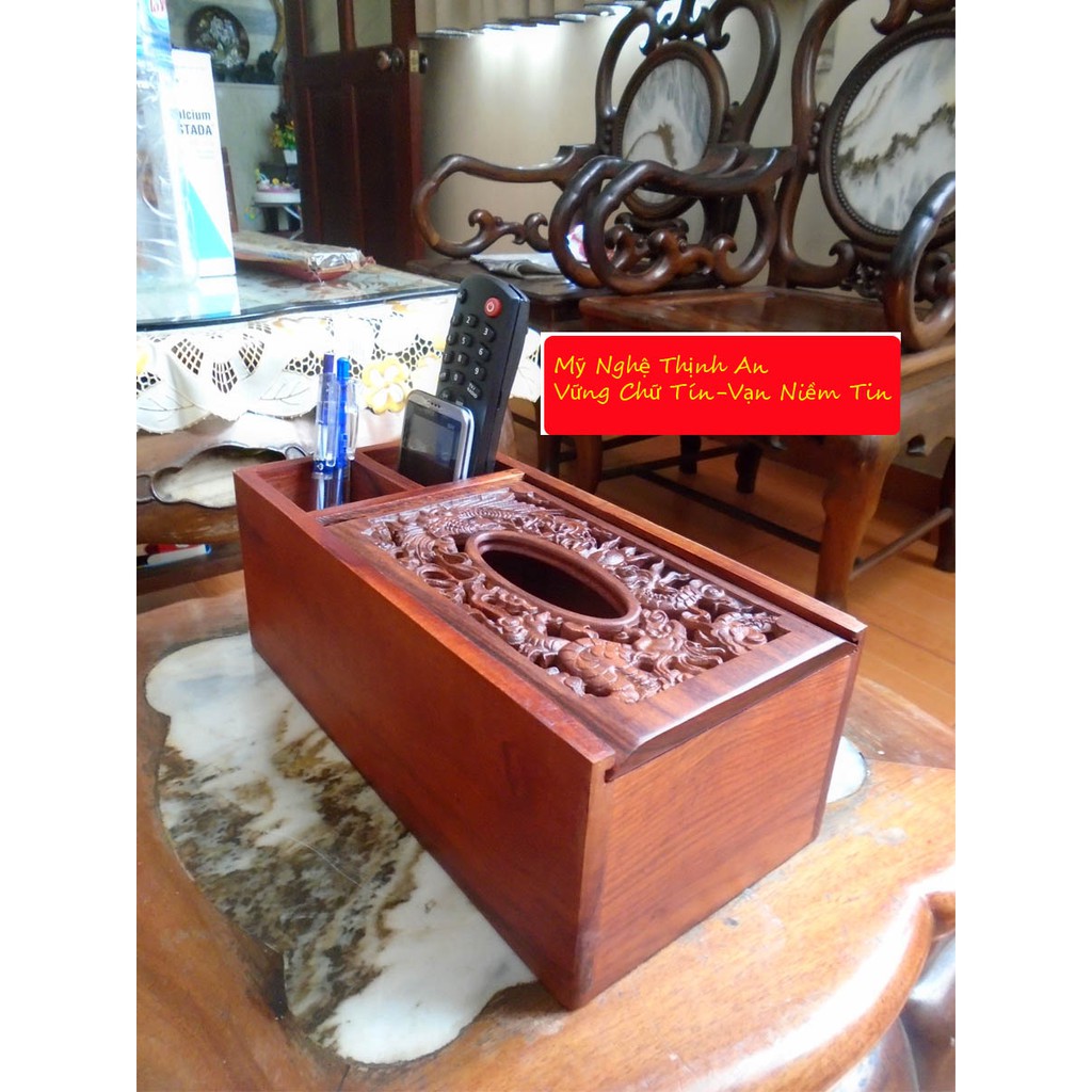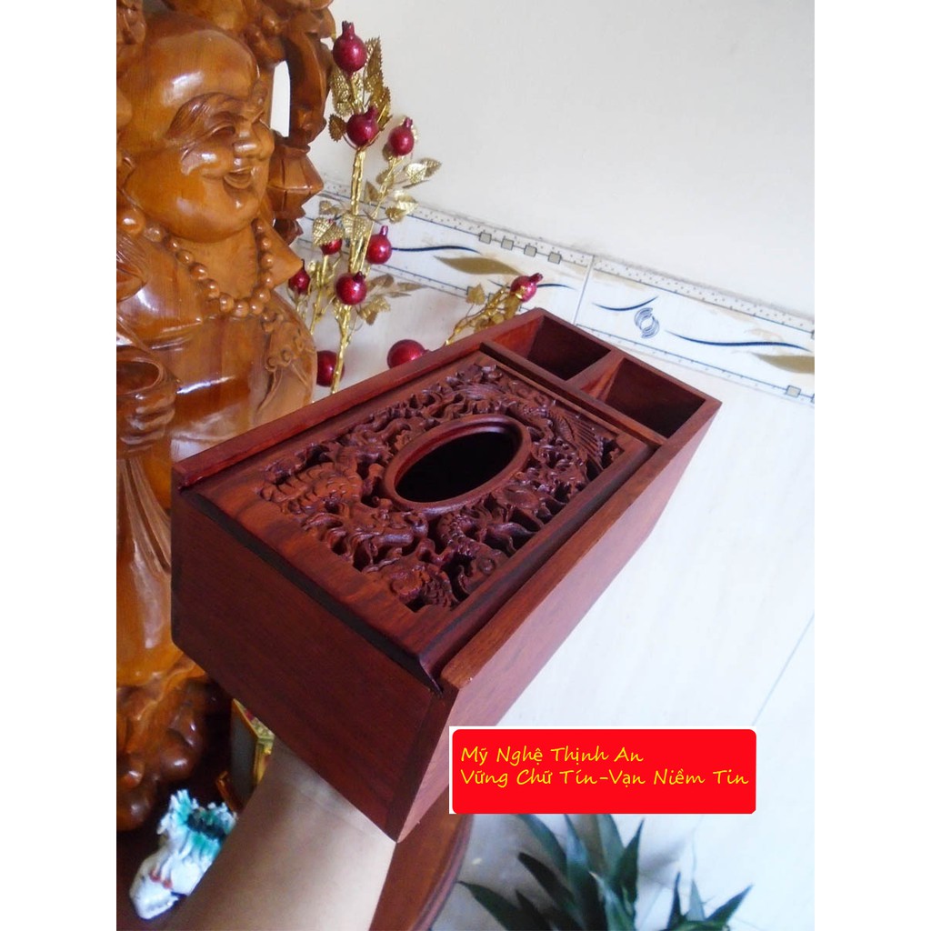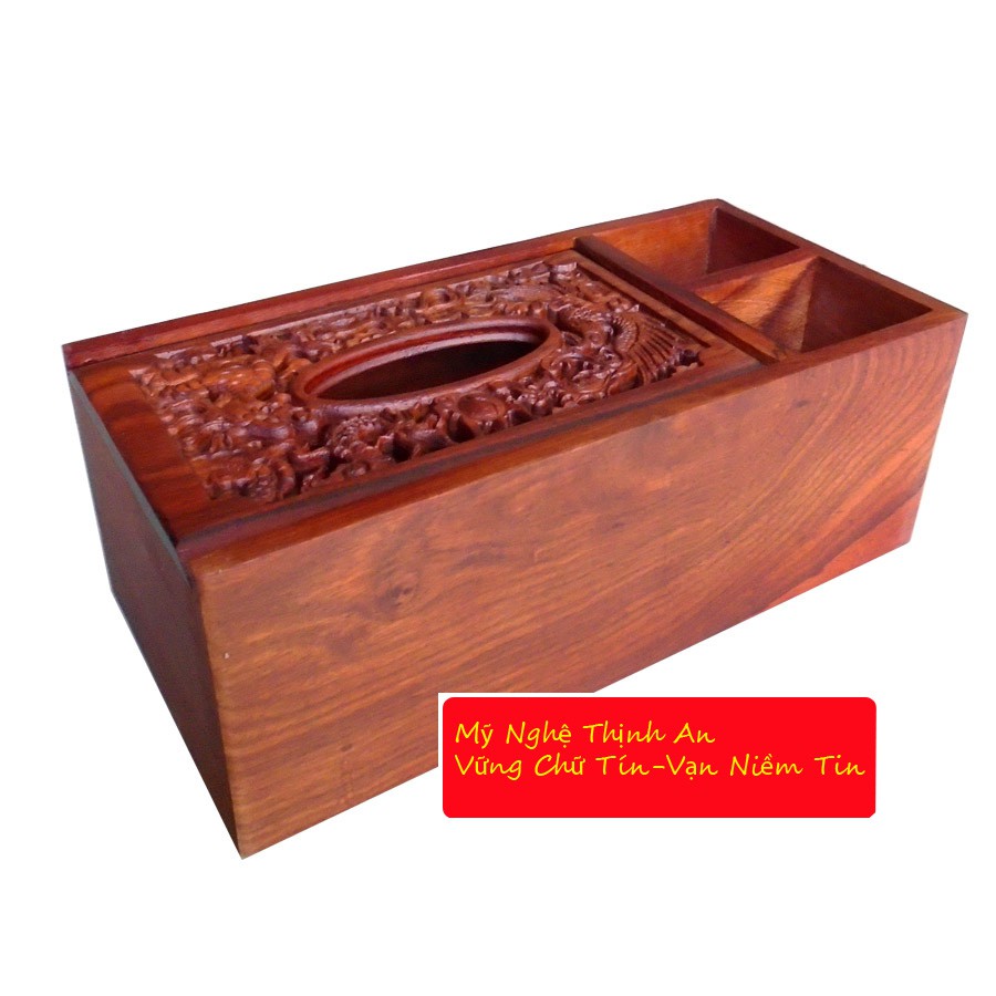 Chiếc hộp được làm chắc chắn, linh hoạt nắp kéo tiện lợi phía trên ngăn chứa khan giấy,còn có them hai ngăn để chứa các vật dụng hay sử dụng như điều khiển TV(remote),máy lạnh,bút viết ….chất liệu gỗ hương ta đỏ tự nhiên quý hiếm,được trạm lọng hoa văn vô cùng cầu kỳ tinh xảo từ đôi bàn tay khéo léo của các nghệ nhân làng nghề Việt.Hộp khăn ăn này có thể là món quà tặng ý nghĩa và độc đáo gửi tới những người thân thiết xa gần trong và ngoài nước hay đối tác làm ăn.sử dụng các sản phẩm thủ công mỹ nghệ cũng là cách ủng hộ cho các sản phẩm tôn vinh nét đẹp Việt Nam nói chung,và các làng nghề truyền thống đang dần mai một trên khắp làng quê Việt nói riêng.