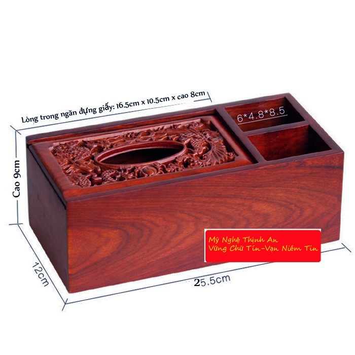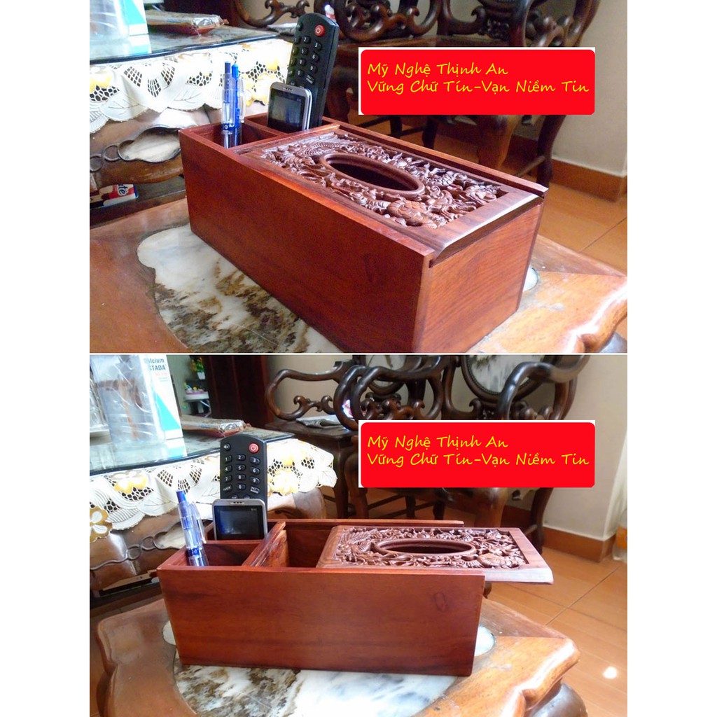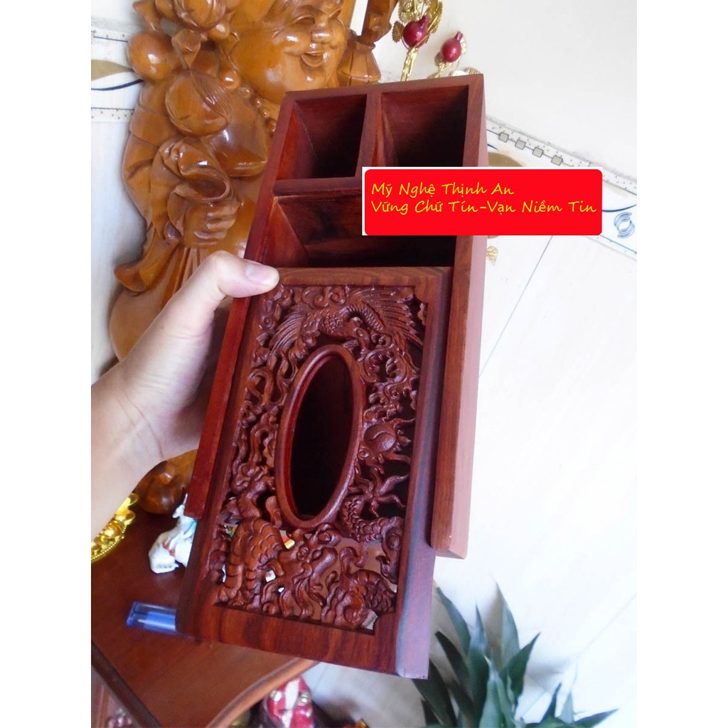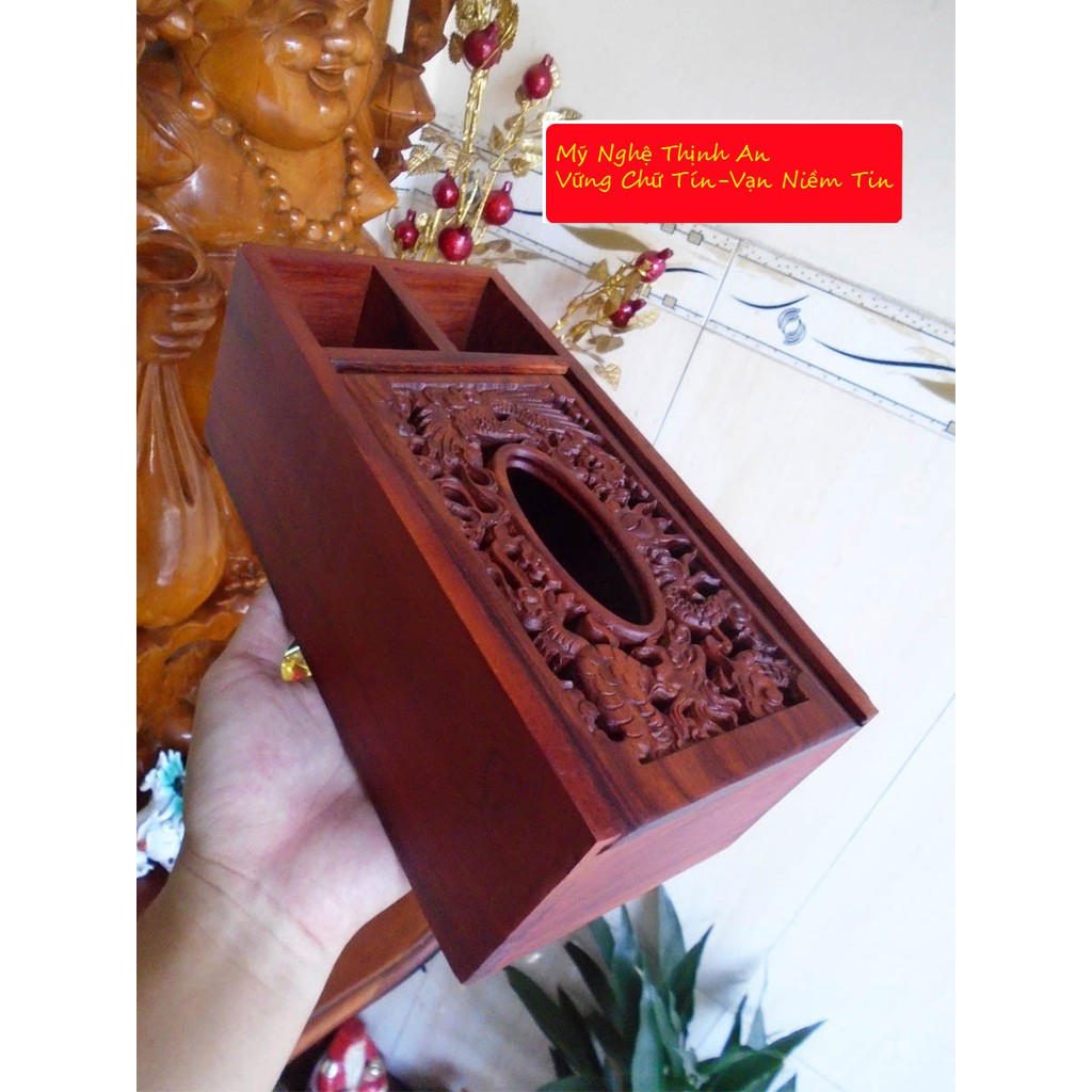 Chiếc hộp được làm chắc chắn, linh hoạt nắp kéo tiện lợi phía trên ngăn chứa khan giấy,còn có them hai ngăn để chứa các vật dụng hay sử dụng như điều khiển TV(remote),máy lạnh,bút viết ….chất liệu gỗ hương ta đỏ tự nhiên quý hiếm,được trạm lọng hoa văn vô cùng cầu kỳ tinh xảo từ đôi bàn tay khéo léo của các nghệ nhân làng nghề Việt.Hộp khăn ăn này có thể là món quà tặng ý nghĩa và độc đáo gửi tới những người thân thiết xa gần trong và ngoài nước hay đối tác làm ăn.sử dụng các sản phẩm thủ công mỹ nghệ cũng là cách ủng hộ cho các sản phẩm tôn vinh nét đẹp Việt Nam nói chung,và các làng nghề truyền thống đang dần mai một trên khắp làng quê Việt nói riêng.
