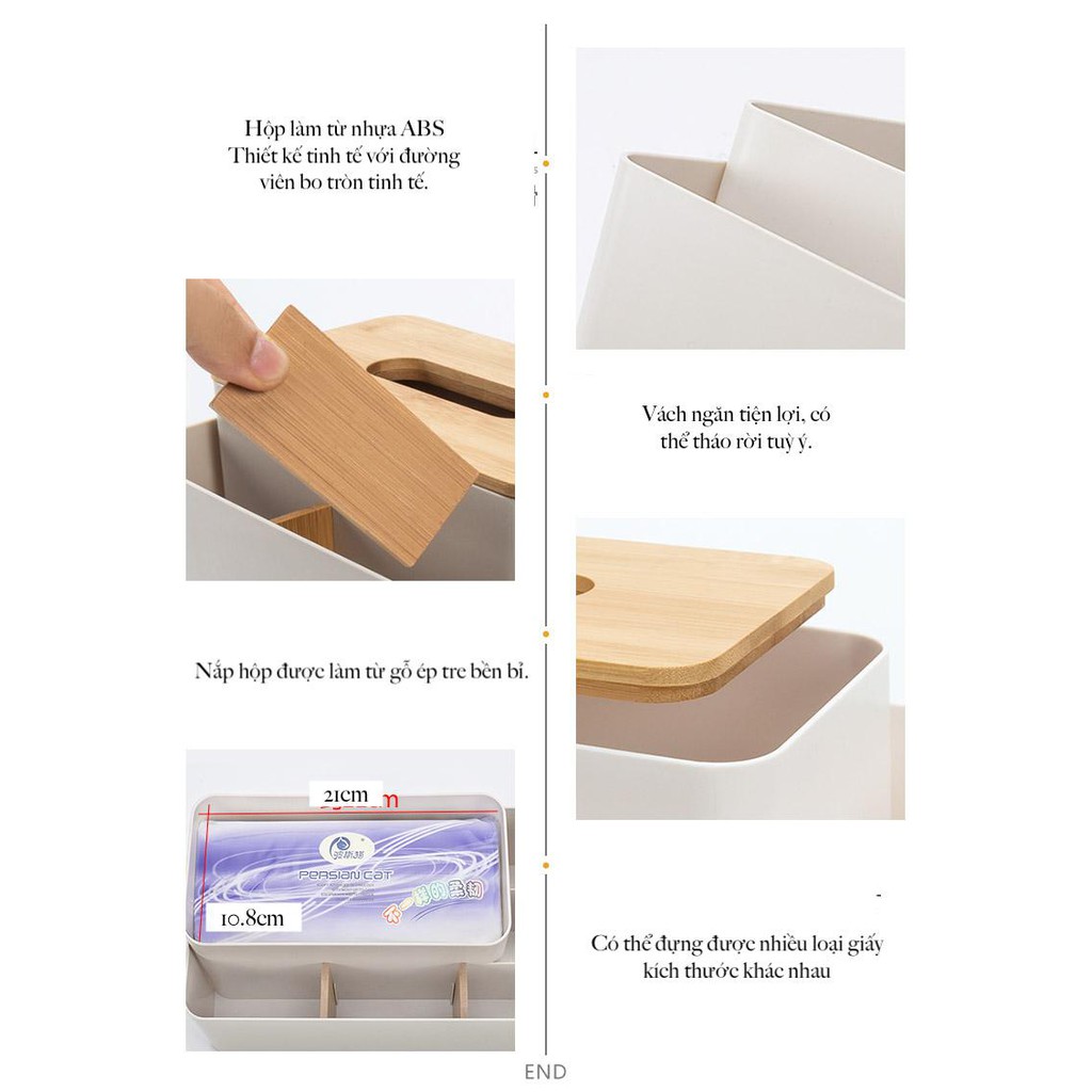 * Chất liệu: Nhựa PP + tre* Khăn giấy áp dụng: Khăn giấy có thể tháo rời