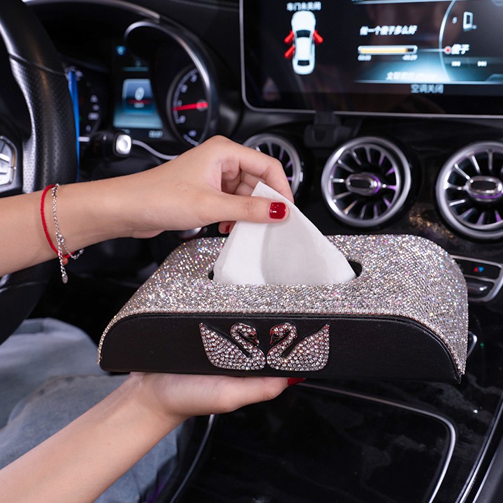 Hộp đựng khăn giấy da đính đá thiên nga cao cấpHộp giấy da chuyên dụng để trên xe ô tô, xe hơi, để bàn trag trí.