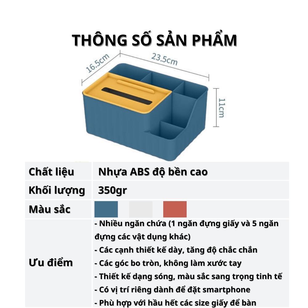 - Số ngăn: 1 ngăn đựng khăn giấy và 5 ngăn đựng các vật dụng khác