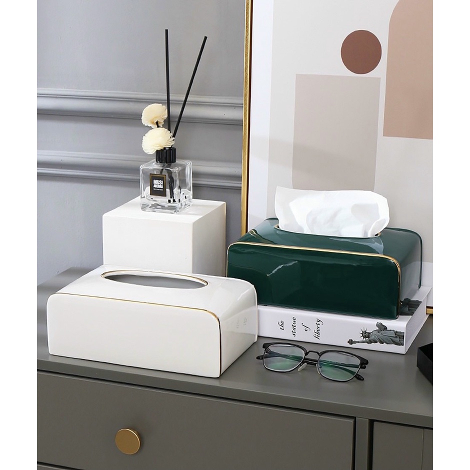 HỘP ĐỰNG KHĂN GIẤY GIẤY ĂN BẰNG GỐM SỨ CÁO CẤP MÀU TRẮNG VIỀN VÀNG