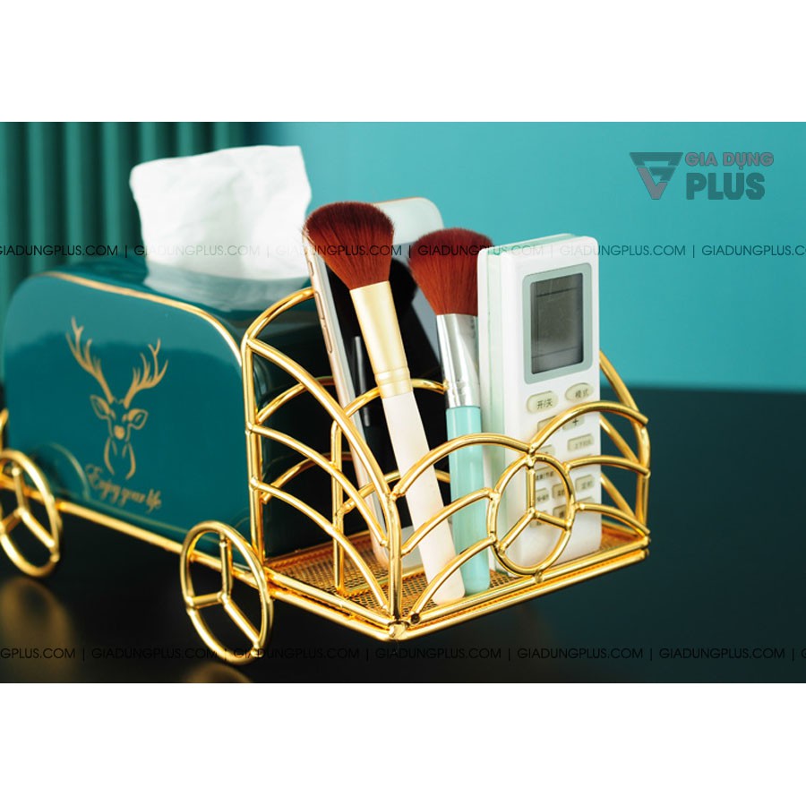 - Hộp đựng giấy bằng sứ xanh ngọc lục bảo kèm kệ mạ vàng để đựng điều khiển, remote đặt bàn đa năng được trang trí bằng biểu tượng nai sừng tấm - quý tộc theo phong cách Bắc Âu.