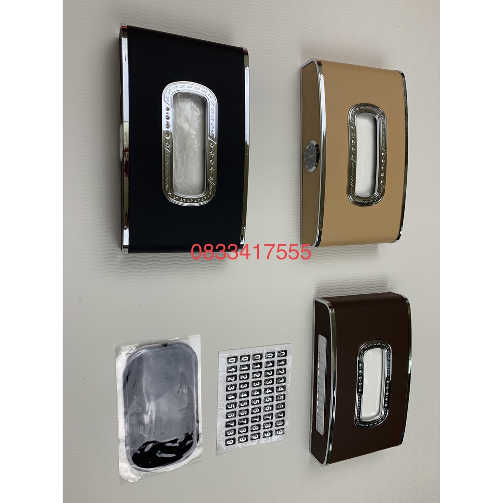 Hộp đựng khăn giấy Luxury đẳng cấp 3 trong 1Hộp Khăn Giấy Luxury là sản phẩm nội thất thiết thực, vừa nhỏ gọn tiện dụng, đồng thời làm tăng vẻ sang trọng cho không gian ô tô của bạn. Sản phẩm giúp để khăn giấy trên xe gọn gàng và không bị bụi bẩn. Hộp Khăn Giấy Luxury được làm từ nhựa cao cấp, bọc bằng da cao cấp chống xước, chống nước, dễ dàng vệ sinh. Sản phẩm tích hợp đồng hồ, vừa xem được giờ, vừa tạo nên vẻ lịch lãm và quý phái cho xế cưng của bạn, đồng thời kèm theo bảng số điện thoại vô cùng tiện dụng.