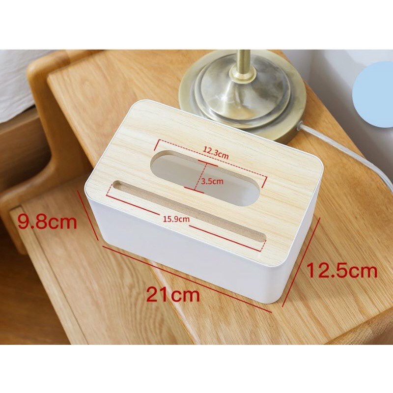 Hộp đựng khăn giấy nắp gỗ decor trang trí để bàn có khe để điện thoại