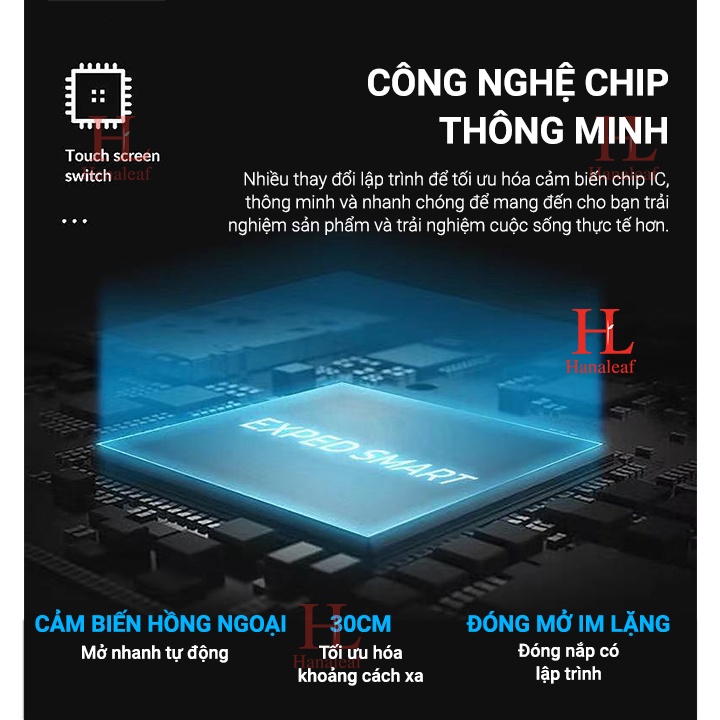 - Cảm ứng OS với độ nhạy cao, phạm vi cảm ứng thân thiện lên tới 30cm, tự động đóng nắp sau 4 giây.