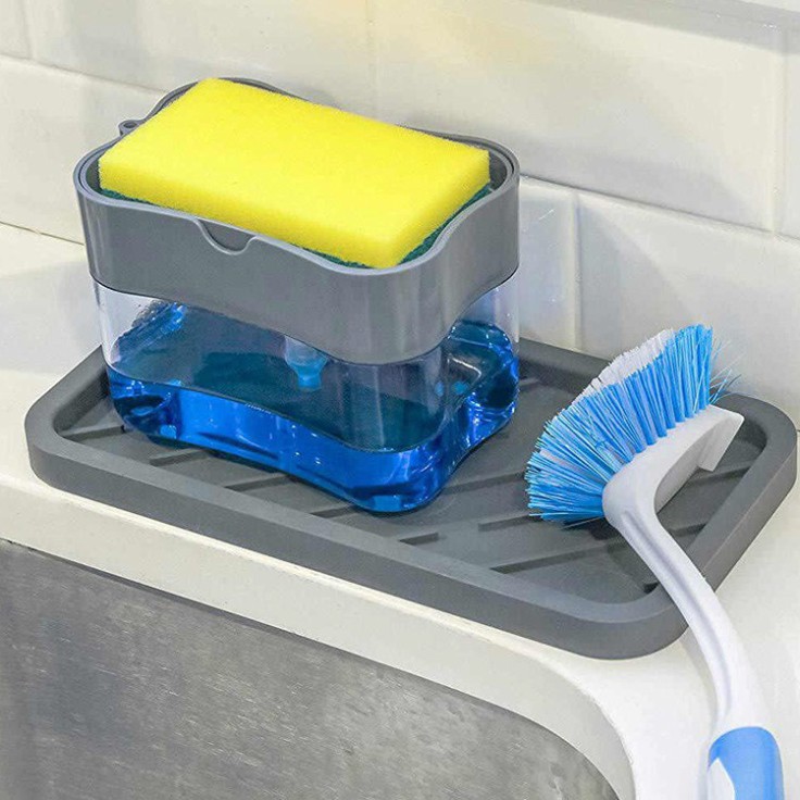 - Bộ phân phối nhả dầu rửa bát 2 trong 1 tức thì chỉ cần dùng 1 tay tiện lợi: Hộp đựng dầu rửa có kèm theo khay giữ bọt biển, miếng cọ rửa ở một vị trí thuận tiện tránh nước khỏi quầy bếp.