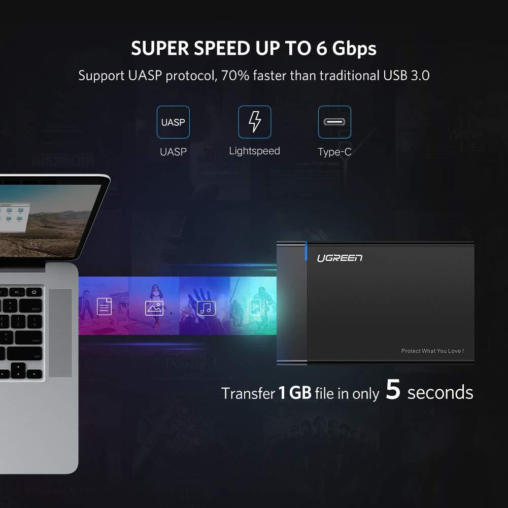 9/ Model 60735 Type-C gen2: Ổ cứng UGREEN USB 3.1 Thế hệ 2 USB Type-C Hộp mực ổ cứng 2,5 inch có thể dễ dàng 2,5 inch HDD / SSD được kết nối với máy tính để bàn, PS4 và các thiết bị khác. Giao diện Type-C hỗ trợ tốc độ truyền lên đến đoạn văn 6Gbps, nhanh hơn 70% so với USB 3.0, USB 2.0 truyền thống và tương thích ngược với cổng USB 1.1. Hỗ trợ dung lượng đĩa cứng lên đến 6TB Sau 3 phút không hoạt động, nó sẽ tự động chuyển sang chế độ nghỉ.