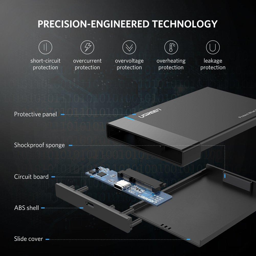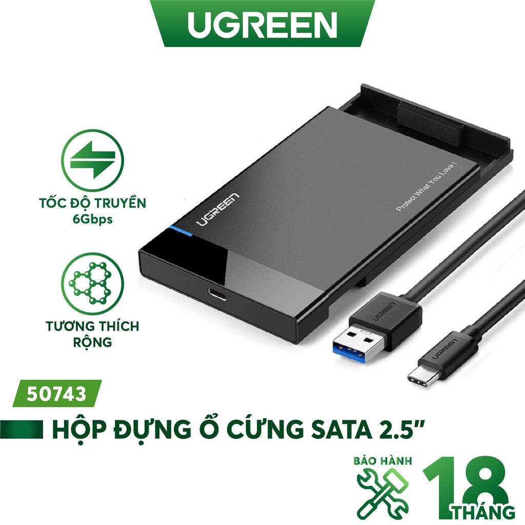 8/ Model 60734: Cổng kết nối: Micro USB ra USB 3.0/USB Type-C 4. Hỗ trợ ổ cứng 6TB, tốc độ 5Gbps 5. 25 x 12 x 4 cm 6. 248 g1. Hộp đựng ổ cứng HDD, SSD có kích thước 2.5 '' với giao tiếp SATA của thương hiệu Ugreen. Là sản phẩm có nhiệm vụ chính là bảo mật ổ đĩa và đảm bảo truyền tải dữ liệu nhanh chóng qua cổng USB 3.0. Túi tương thích với Windows, Linux và Mac OS. Nhờ nó, bạn có thể kết nối ổ đĩa 2,5 '' với máy tính, TV hoặc bảng điều khiển trò chơi.