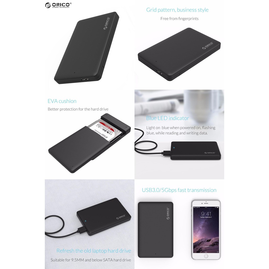- Sản xuất tại Trung Quốc Vở đựng ổ cứng HDD BOX 2.5'' Orico 2577US3 là một sản phẩm mới với giao tiếp chuẩn USB 3.0 của hãng Orico,BOX SATA này có thể được sử dụng cho tất các ổ cứng 2.5 inch ngoài thị trường. Khách hàng có thể sử dụng giao diện USB3.0 siêu tốc để lưu trữ các dữ liệu mà họ cần, Với chuẩn 3.0 tốc độ truyền cao nhất đến 5 Gb/s. Nó cũng tương thích ngược với USB 2.0 & 1.1, nếu hệ thống phần cứng của bạn không có cổng USB3.0, Orico 2577US3 có thiết kế vỏ màu đen, bề mặt là chất liệu vẽ kim loại nhôm, không chỉ thời trang mà còn có thể thúc đẩy phát xạ của HDD. Phía mặt trước có một đèn LED giúp bạn có thể biết trạng thái ổ cứng đang làm việc hay không.