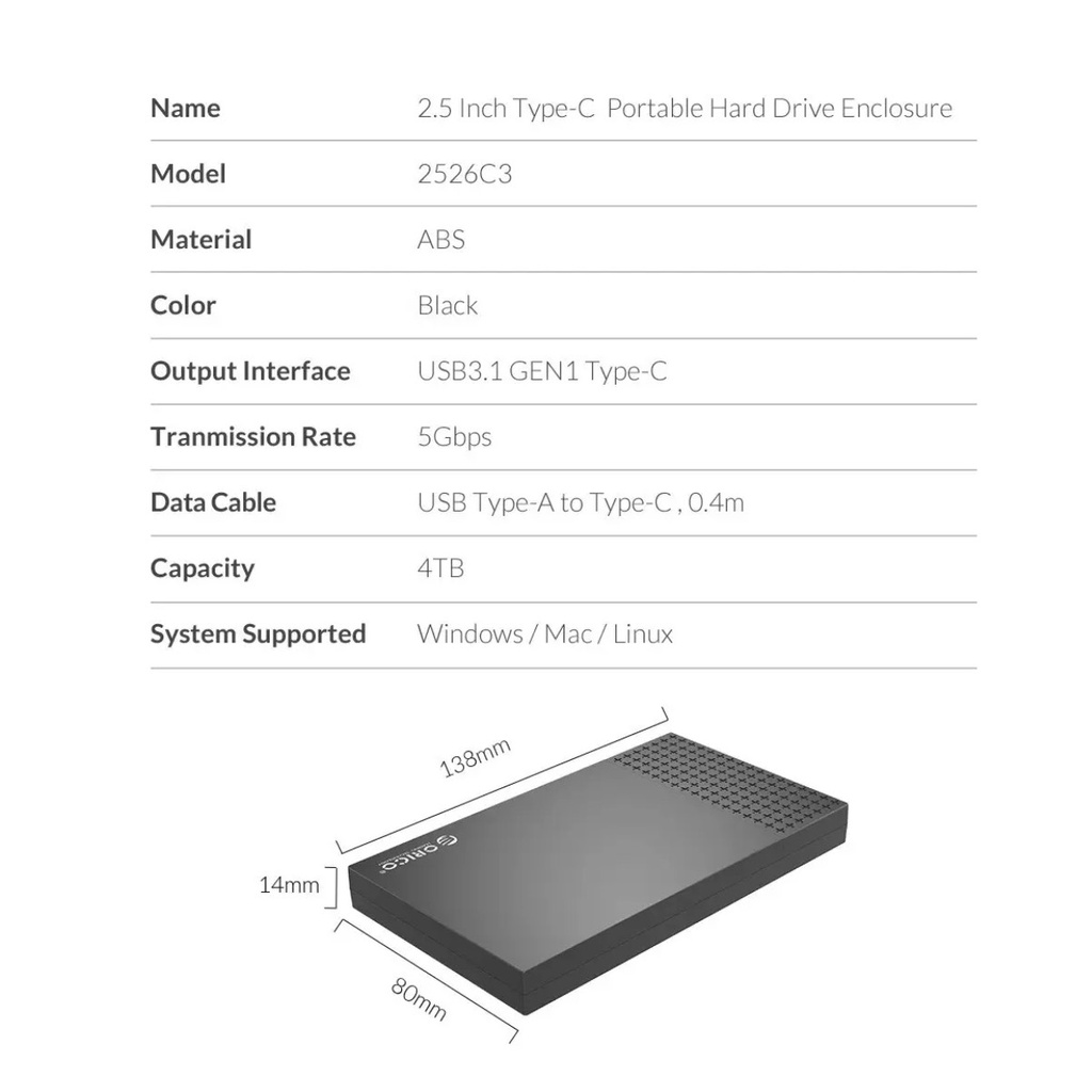 Giới thiệu Hộp đựng Ổ Cứng HDD, SSD 2.5in ORICO 2526C3 USB 3.0 Type C