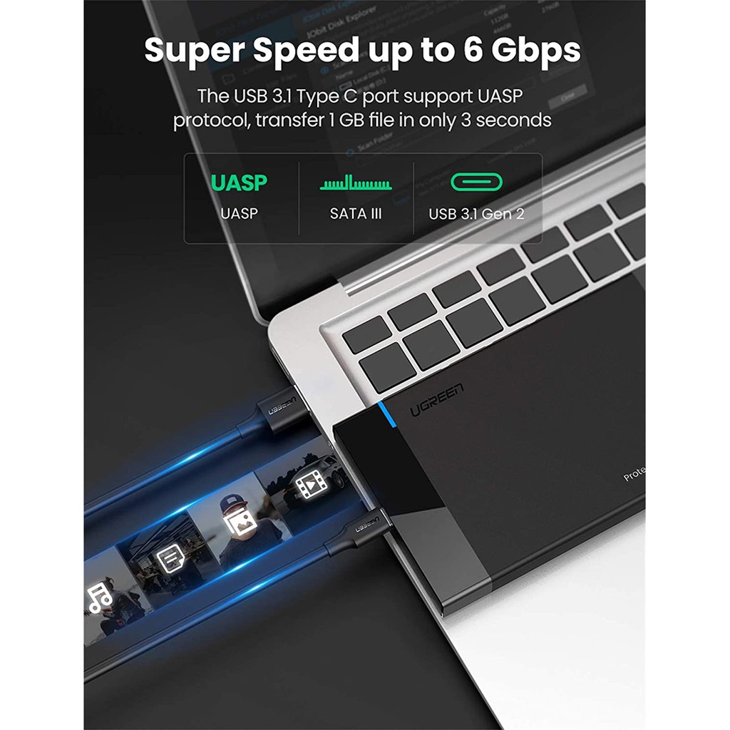 ◇ Hộp đựng ổ cứng Ugreen 50743 cho tốc độ truyền tải dữ liệu cao nhất lên đến 6Gbps khi kết nối cổng USB-C.
