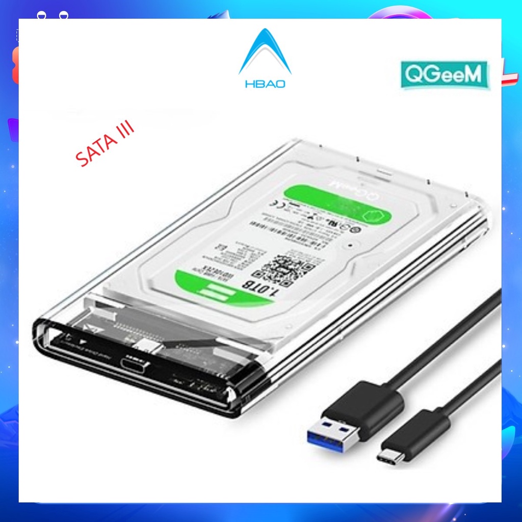 Máy tính & Laptop > Thiết Bị Lưu Trữ > Thiết Bị Đựng Ổ Cứng || Hộp đựng ổ cứng trong suốt HDD/SSD 2.5" QGeeM Type C to SATA I II III tốc độ cao lên tới 6Gbps kèm cáp Type C to USB-ACòn hàng