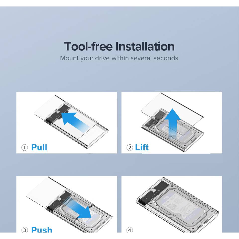 Dùng cho cả HDD và SSD loại 2.5": tối đa lên đến 6 TB với độ dày 7 mm và 9,5 mm, ổ HDD hoặc SSD có cổng sata từ các hãng Western Digital, Seagate, Toshiba, Samsung.