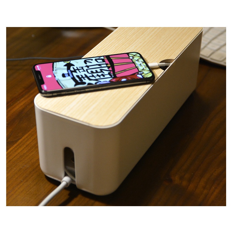 Với thiết kế hộp đựng ổ cắm điện bằng nhựa ABS nắp gỗ tự nhiên chống cháy nổ rất an toàn, tiện lợi, những chiếc ổ cắm được giấu ở bên trong, đặt gọn gàng hơn, những đoạn dây điện thừa được bọc gói cẩn thận giúp an toàn hơn cho người sử dụng.