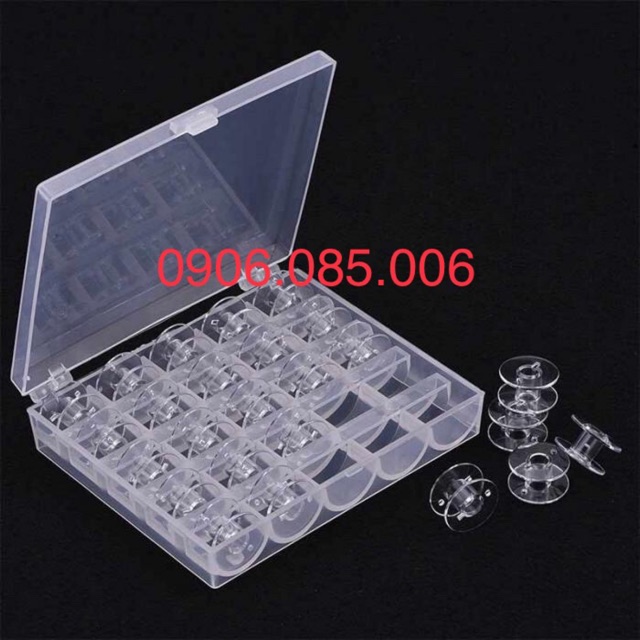 Hộp đựng suốt 25 chiếc ( chưa bao gồm chỉ). Dùng cho máy brother, singer, Juki, toyota, Janome, Jaqua.