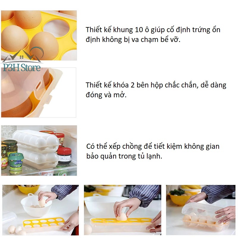 - Chất liệu: nhựa PP. Hộp có nắp đậy giúp bảo vệ trứng, vừa có thể xếp chồng các khay lên nhau tiết kiệm diện tích.