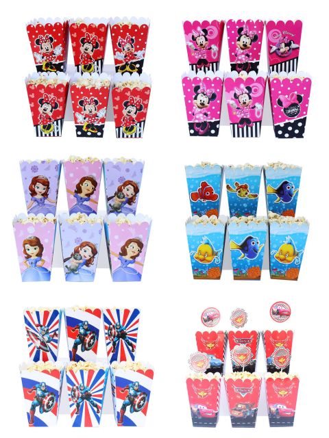 Hộp đựng bắp trang trí sinh nhật nhiều chủ đề dễ thương- bộ gồm 6 hộp + tem cắm trang trí