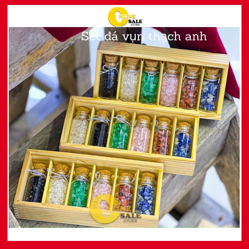 [Mới] Hộp gỗ 6 lọ thủy tinh đá, hũ đá phong thủy trang trí để bàn làm quà tặng ý nghĩa, thanh tẩy tarot- 1 hộp : gồm 6 lọ đá với 6 màu khách nhau