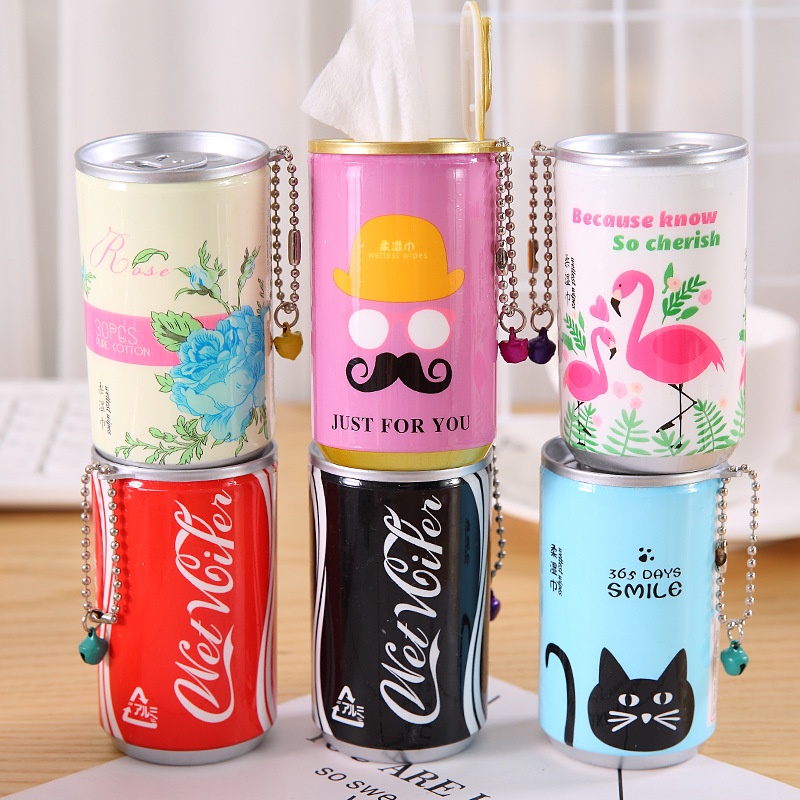- Dạng lon nước giải khát, có lỗ khui rút khăn giấy ướt rất độc đáo và đáng yêu.- Ngoài ra còn kèm theo 1 dây móc khóa có thể móc vào balô hay túi xách để trang trí lun nha -