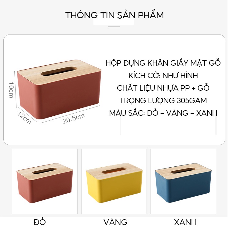 Hộp khăn giấy có thân hộp bằng nhựa, màu sắc trẻ trung, mặt hộp được làm bằng gỗ ép sang trọng thanh lịch. Là một sản phẩm décor cho ngôi nhà – căn phòng của bạn.