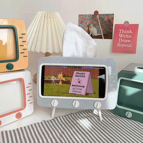 - Khay đựng giấy ăn ti vi để bàn, tích hợp cùng giá đỡ điện thoại giúp bạn thoải mái vừa xem phim vừa rảnh tay làm những công việc mình ưa thích