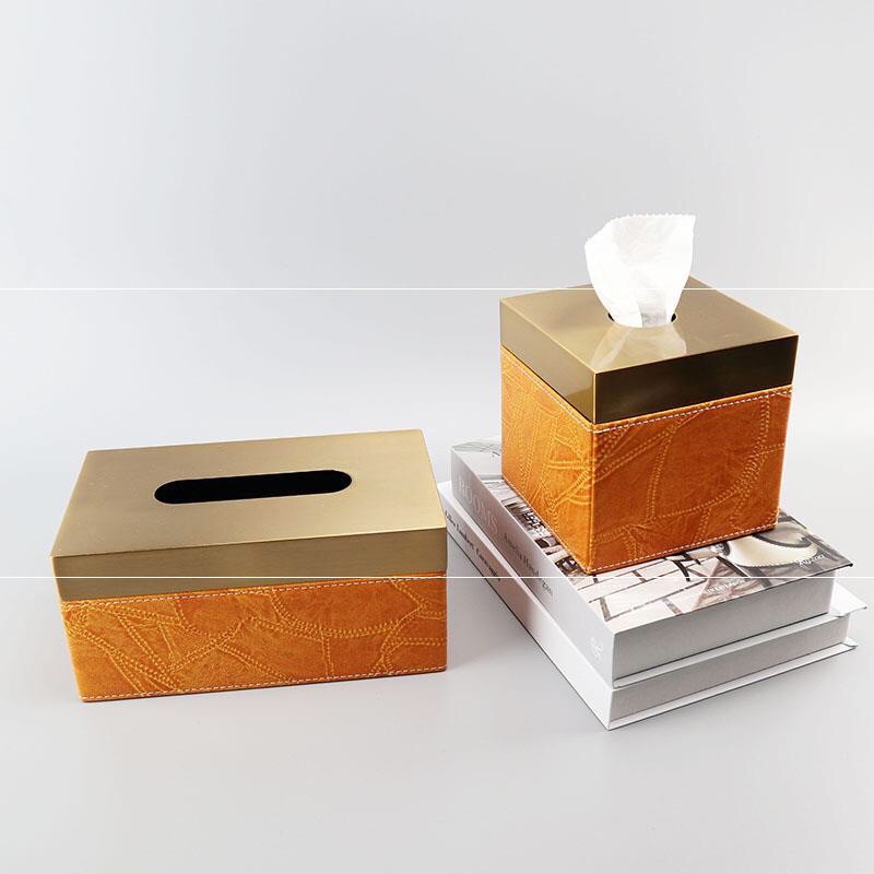 Hộp khăn giấy vuông da lót nhung nắp kim loại vàng, Hộp đựng khăn giấy cao cấp