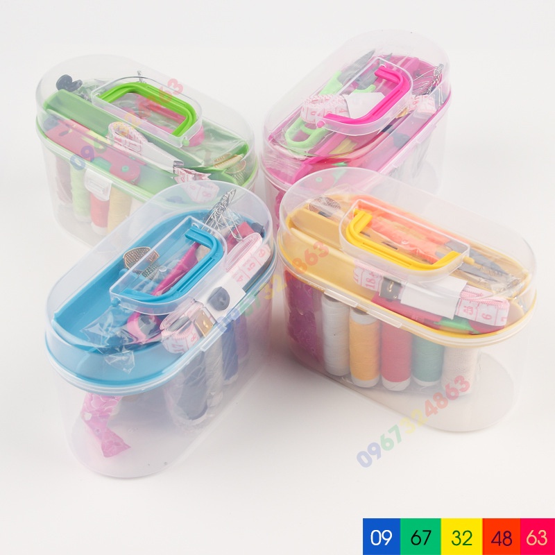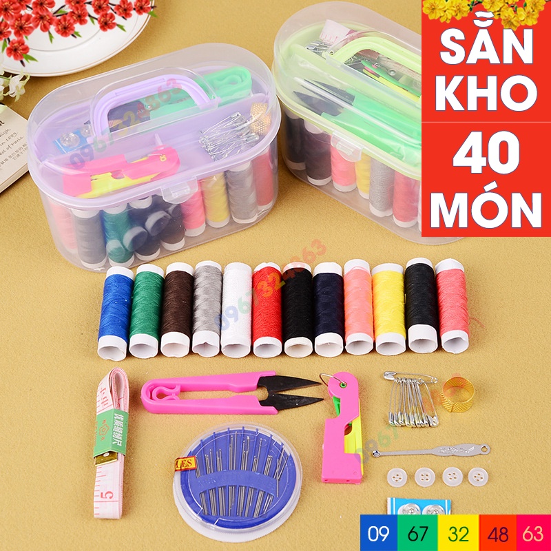 🍀 40 món bao gồm: 1 hộp nhựa xách tay 2 tầng, 10 cuộn chỉ màu, 16 cây kim các loại, 01 que xỏ kim, 01 kéo cắt chỉ, 01 thước dây, 01 cốc nhỏ, 04 khuy, 05 cúc bấm