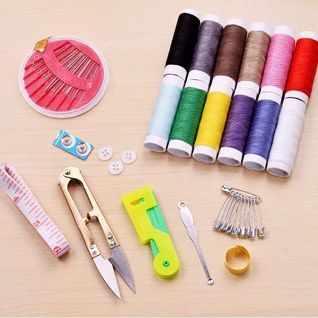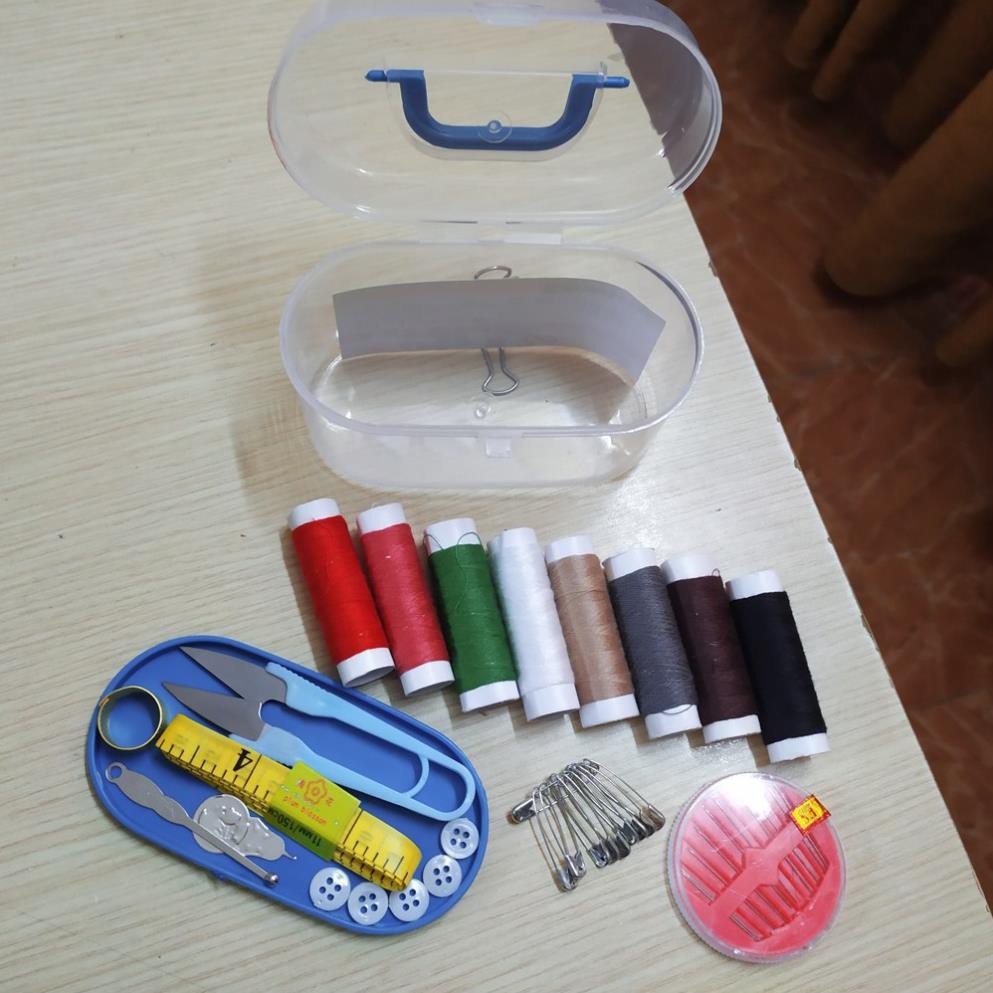 – Bộ sản phẩm bao gồm: 12 cuộn chỉ các màu, 01 hộp kim các loại (25 chiếc) , 01 kéo cắt chỉ, 01 thước dây, 01 dụng cụ xỏ chỉ, 10 kim băng, 02 cúc bấm, 01 bấm móng tay, 01 dụng cụ lấy ráy tai, 01 nhẫn ấn kim.