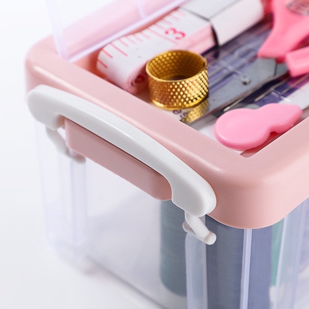 Gồm: 12 cuộn chỉ, bộ kim, thước dây, kéo, nhẫn ấn kim, dụng cụ xỏ chỉ