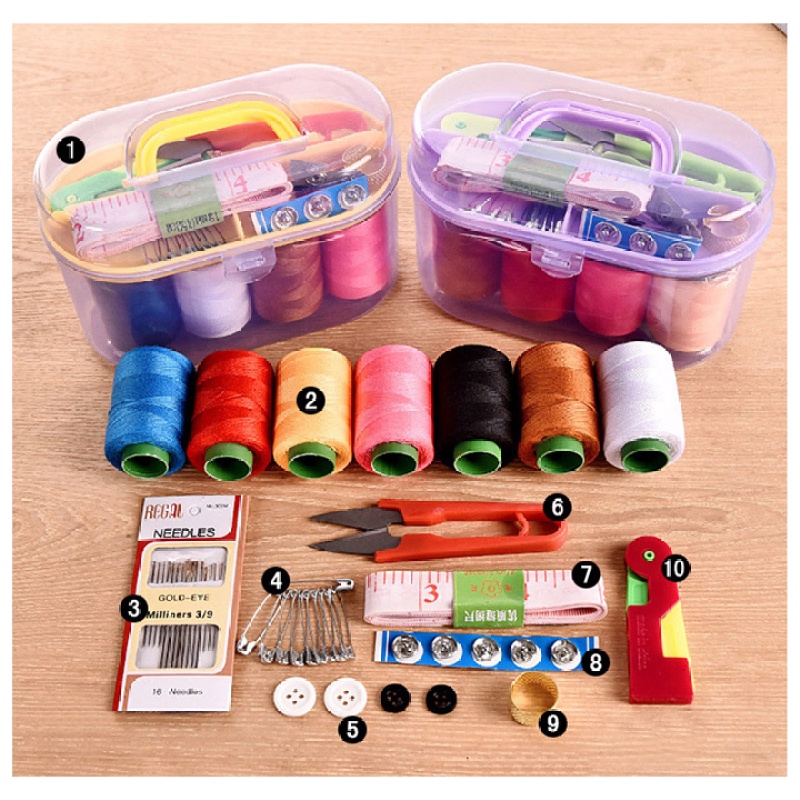 – Bộ sản phẩm bao gồm: 12 cuộn chỉ các màu, 01 hộp kim các loại (25 chiếc) , 01 kéo cắt chỉ, 01 thước dây, 01 dụng cụ xỏ chỉ, 10 kim băng, 02 cúc bấm, 01 bấm móng tay, 01 dụng cụ lấy ráy tai, 01 nhẫn ấn kim.