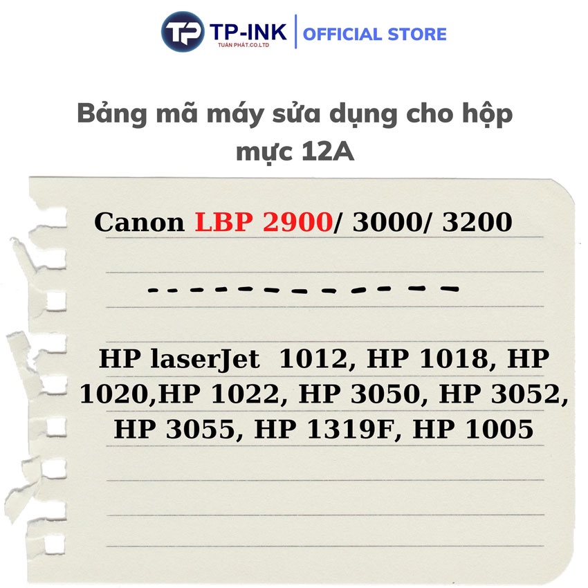 - Đặt chất lượng lên hàng đầu, TP cam kết đem lại sản phẩm có chất lượng tốt nhất cho khách hàng. Hộp mực 12A có thể nạp gấp 3 số lần nạp các hộp mực khác trên thị trựờng mà không cần thay thế bất kỳ 1 linh kiện nào trong hộp mực . Tiết kiệm thời, gian công sức và kinh phí.