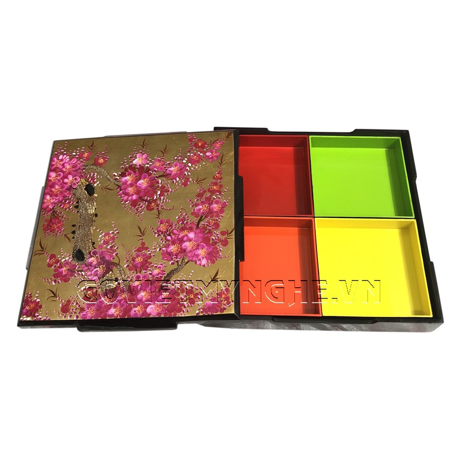 + Hộp mứt sơn mài được thiết kế 4 ngăn vuông rất tiện lợi cho việc đựng bánh mứt ngày tết, dễ dàng tháo lắp để vệ sinh và lưu giữ khi không có nhu cầu sử dụng.