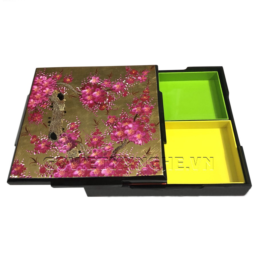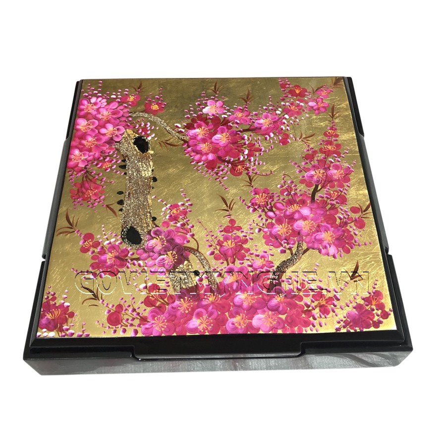 - 01 Hộp Mứt Sơn Mài Vuông 30cm - Vẽ hoa đào tím & nền vàng
