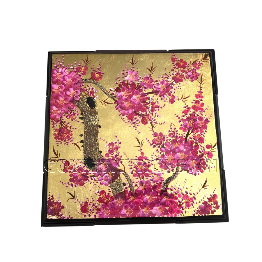 Hộp Mứt Sơn Mài Vuông 30cm - Vẽ hoa đào tím & nền vàng