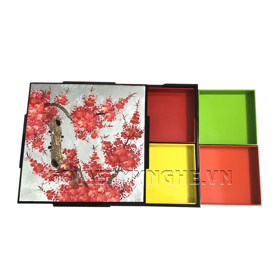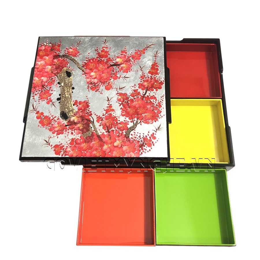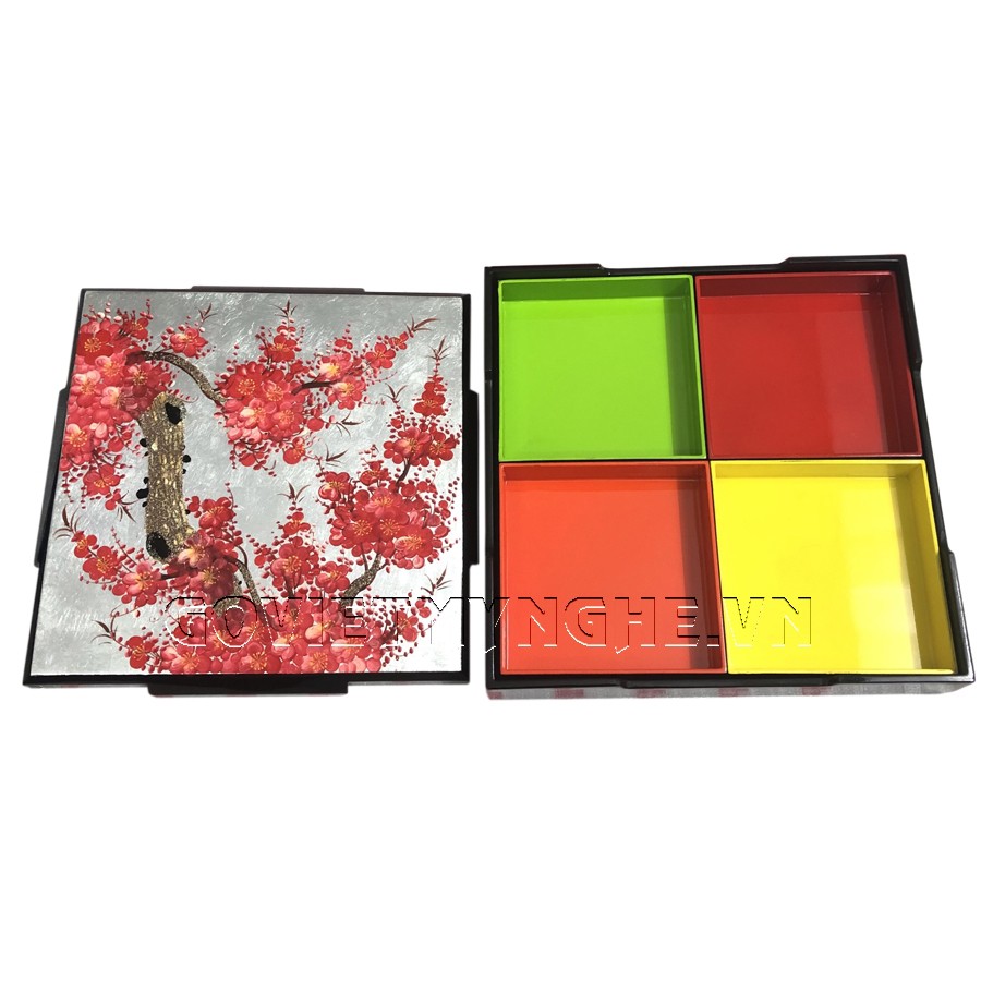 + Hộp mứt sơn mài được thiết kế 4 ngăn vuông rất tiện lợi cho việc đựng bánh mứt ngày tết, dễ dàng tháo lắp để vệ sinh và lưu giữ khi không có nhu cầu sử dụng.