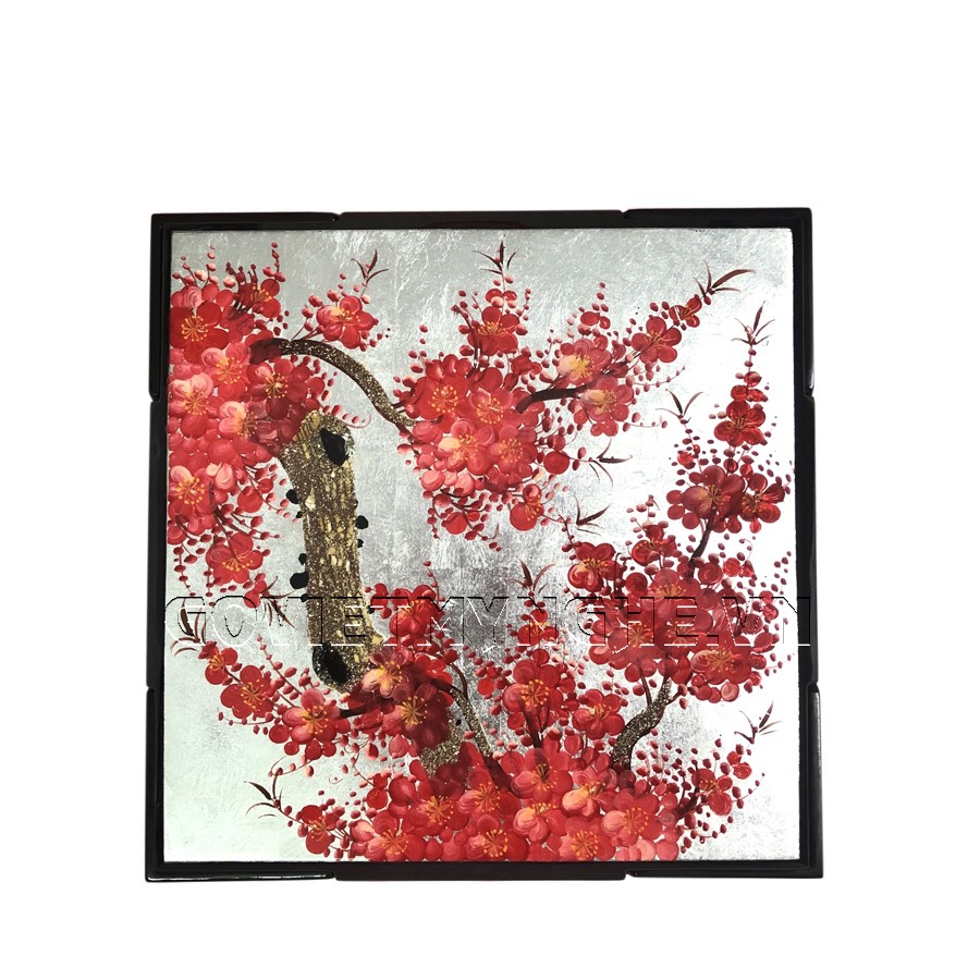 - 01 Hộp Mứt Sơn Mài Vuông 30cm - Vẽ hoa đào đỏ & nền bạc